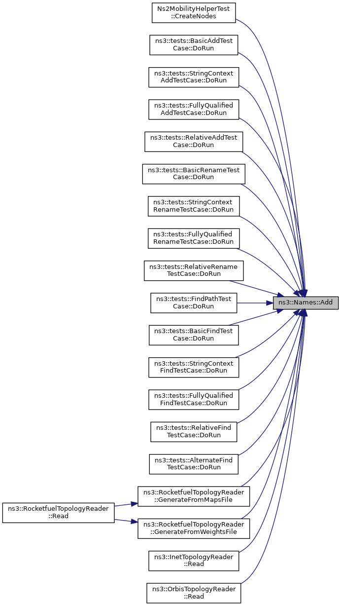 Referenced by Ns2MobilityHelperTest::CreateNodes(), ns3::tests::BasicAddTestCase::DoRun(), ns3::tests::StringContextAddTestCase::DoRun(), ns3::tests::FullyQualifiedAddTestCase::DoRun(), ns3::tests::RelativeAddTestCase::DoRun(), ns3::tests::BasicRenameTestCase::DoRun(), ns3::tests::StringContextRenameTestCase::DoRun(), ns3::tests::FullyQualifiedRenameTestCase::DoRun(), ns3::tests::RelativeRenameTestCase::DoRun(), ns3::tests::FindPathTestCase::DoRun(), ns3::tests::BasicFindTestCase::DoRun(), ns3::tests::StringContextFindTestCase::DoRun(), ns3::tests::FullyQualifiedFindTestCase::DoRun(), ns3::tests::RelativeFindTestCase::DoRun(), ns3::tests::AlternateFindTestCase::DoRun(), ns3::RocketfuelTopologyReader::GenerateFromMapsFile(), ns3::RocketfuelTopologyReader::GenerateFromWeightsFile(), ns3::InetTopologyReader::Read(), and ns3::OrbisTopologyReader::Read().