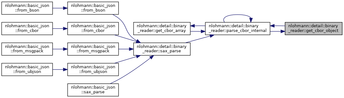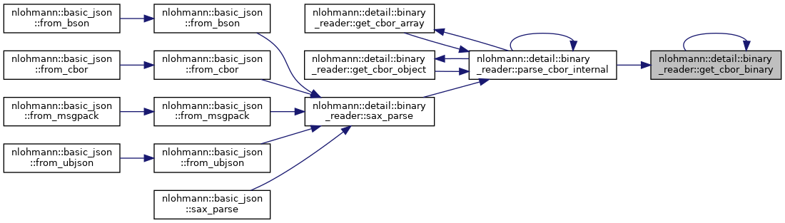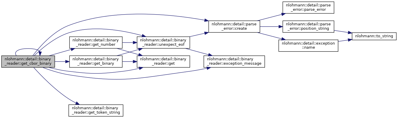 References nlohmann::detail::cbor, nlohmann::detail::binary_reader< BasicJsonType, InputAdapterType, SAX >::chars_read, nlohmann::detail::parse_error::create(), nlohmann::detail::binary_reader< BasicJsonType, InputAdapterType, SAX >::current, nlohmann::detail::error, nlohmann::detail::binary_reader< BasicJsonType, InputAdapterType, SAX >::exception_message(), nlohmann::detail::binary_reader< BasicJsonType, InputAdapterType, SAX >::get(), nlohmann::detail::binary_reader< BasicJsonType, InputAdapterType, SAX >::get_cbor_array(), nlohmann::detail::binary_reader< BasicJsonType, InputAdapterType, SAX >::get_cbor_binary(), nlohmann::detail::binary_reader< BasicJsonType, InputAdapterType, SAX >::get_cbor_object(), nlohmann::detail::binary_reader< BasicJsonType, InputAdapterType, SAX >::get_cbor_string(), nlohmann::detail::binary_reader< BasicJsonType, InputAdapterType, SAX >::get_number(), nlohmann::detail::binary_reader< BasicJsonType, InputAdapterType, SAX >::get_token_string(), nlohmann::detail::ignore, JSON_ASSERT, JSON_HEDLEY_UNLIKELY, nlohmann::detail::binary_reader< BasicJsonType, InputAdapterType, SAX >::parse_cbor_internal(), nlohmann::detail::binary_reader< BasicJsonType, InputAdapterType, SAX >::sax, and nlohmann::detail::binary_reader< BasicJsonType, InputAdapterType, SAX >::unexpect_eof().