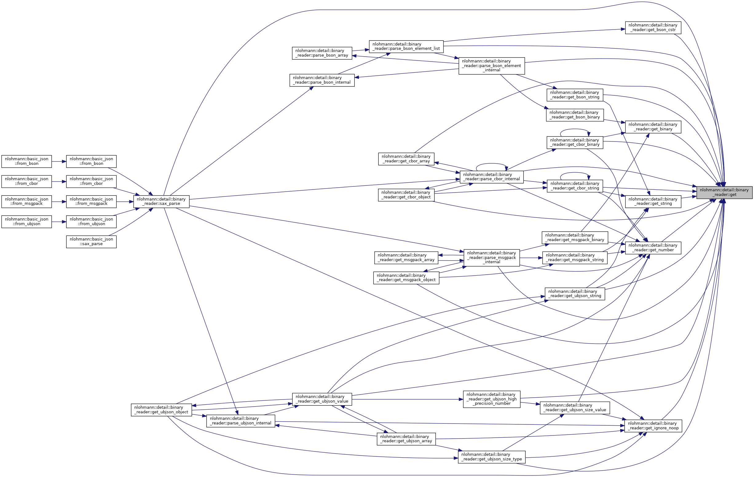 Referenced by nlohmann::detail::binary_reader< BasicJsonType, InputAdapterType, SAX >::get(), nlohmann::detail::binary_reader< BasicJsonType, InputAdapterType, SAX >::get_bson_binary(), nlohmann::detail::binary_reader< BasicJsonType, InputAdapterType, SAX >::get_bson_string(), nlohmann::detail::binary_reader< BasicJsonType, InputAdapterType, SAX >::get_cbor_binary(), nlohmann::detail::binary_reader< BasicJsonType, InputAdapterType, SAX >::get_cbor_string(), nlohmann::detail::binary_reader< BasicJsonType, InputAdapterType, SAX >::get_msgpack_string(), nlohmann::detail::binary_reader< BasicJsonType, InputAdapterType, SAX >::get_ubjson_high_precision_number(), nlohmann::detail::binary_reader< BasicJsonType, InputAdapterType, SAX >::get_ubjson_size_type(), nlohmann::detail::binary_reader< BasicJsonType, InputAdapterType, SAX >::get_ubjson_size_value(), nlohmann::detail::binary_reader< BasicJsonType, InputAdapterType, SAX >::get_ubjson_string(), nlohmann::detail::binary_reader< BasicJsonType, InputAdapterType, SAX >::get_ubjson_value(), nlohmann::detail::binary_reader< BasicJsonType, InputAdapterType, SAX >::parse_bson_element_list(), nlohmann::detail::binary_reader< BasicJsonType, InputAdapterType, SAX >::parse_cbor_internal(), nlohmann::detail::binary_reader< BasicJsonType, InputAdapterType, SAX >::parse_msgpack_internal(), nlohmann::detail::binary_reader< BasicJsonType, InputAdapterType, SAX >::sax_parse(), and nlohmann::detail::binary_reader< BasicJsonType, InputAdapterType, SAX >::unexpect_eof().