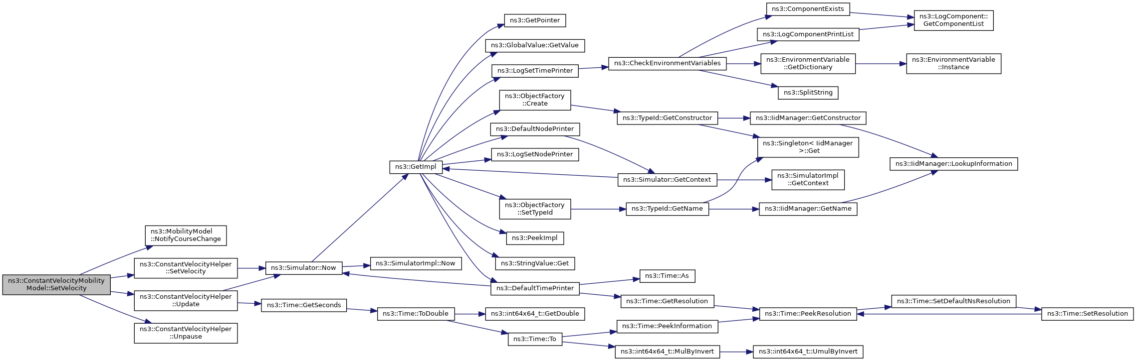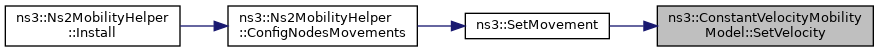 Here is the call graph for this function:| void ns3::ConstantVelocityMobilityModel::SetVelocity | ( | const Vector & | speed | ) |