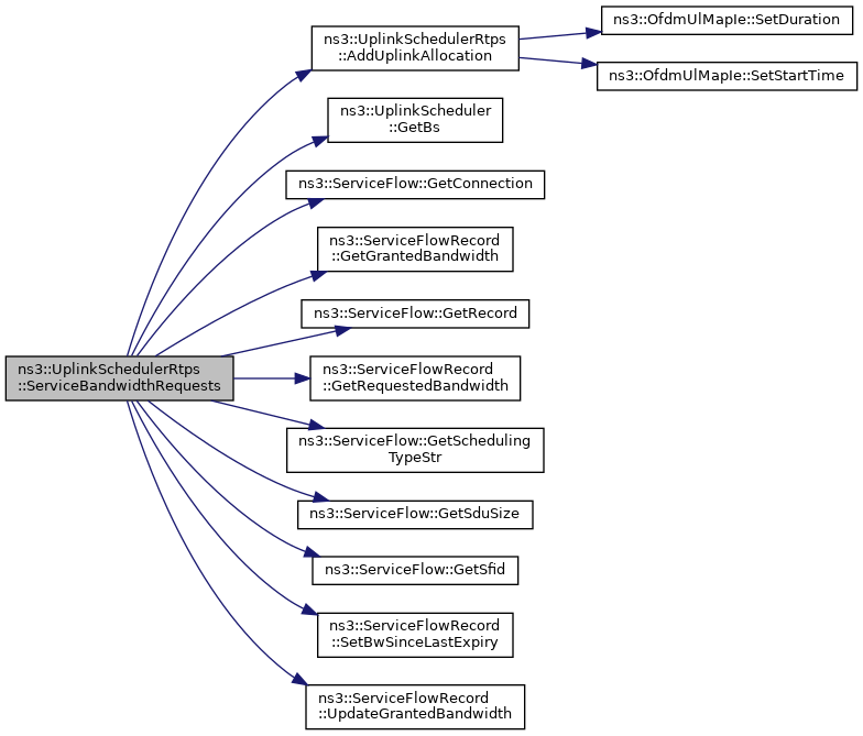 References AddUplinkAllocation(), ns3::UplinkScheduler::GetBs(), ns3::ServiceFlowRecord::GetBwSinceLastExpiry(), ns3::ServiceFlow::GetConnection(), ns3::ServiceFlowRecord::GetGrantTimeStamp(), ns3::ServiceFlow::GetRecord(), ns3::ServiceFlow::GetSchedulingType(), ns3::ServiceFlow::GetSchedulingTypeStr(), ns3::SSRecord::GetServiceFlows(), ns3::ServiceFlow::GetSfid(), ns3::OfdmUlMapIe::GetUiuc(), ns3::Simulator::Now(), NS_LOG_DEBUG, ns3::Seconds(), ServiceBandwidthRequests(), ns3::ServiceFlowRecord::SetBwSinceLastExpiry(), ns3::ServiceFlowRecord::SetGrantTimeStamp(), ns3::OfdmUlMapIe::SetStartTime(), ns3::OfdmUlMapIe::SetUiuc(), ns3::ServiceFlow::SF_TYPE_NRTPS, ns3::ServiceFlow::SF_TYPE_UGS, and ns3::OfdmUlBurstProfile::UIUC_REQ_REGION_FULL.