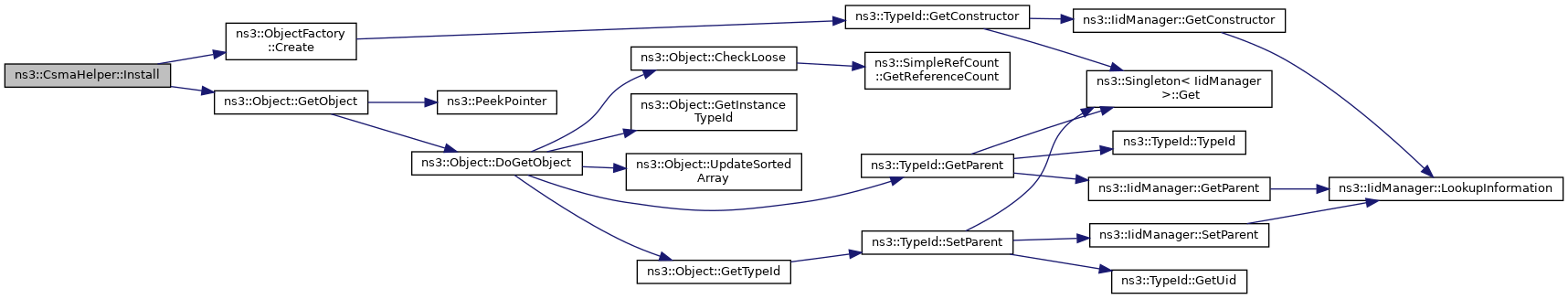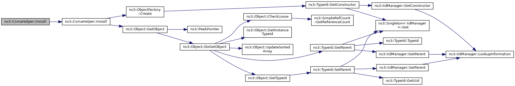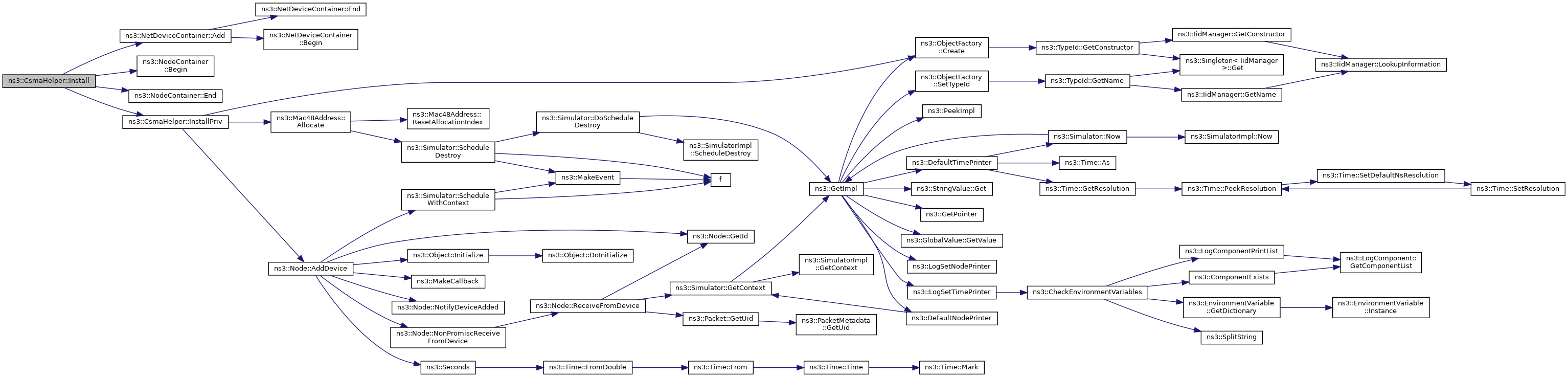 Here is the call graph for this function:| NetDeviceContainer ns3::CsmaHelper::Install | ( | const NodeContainer & | c, |