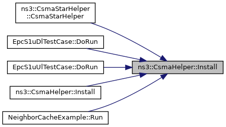Here is the call graph for this function:| NetDeviceContainer ns3::CsmaHelper::Install | ( | Ptr< Node > | node | ) | const |