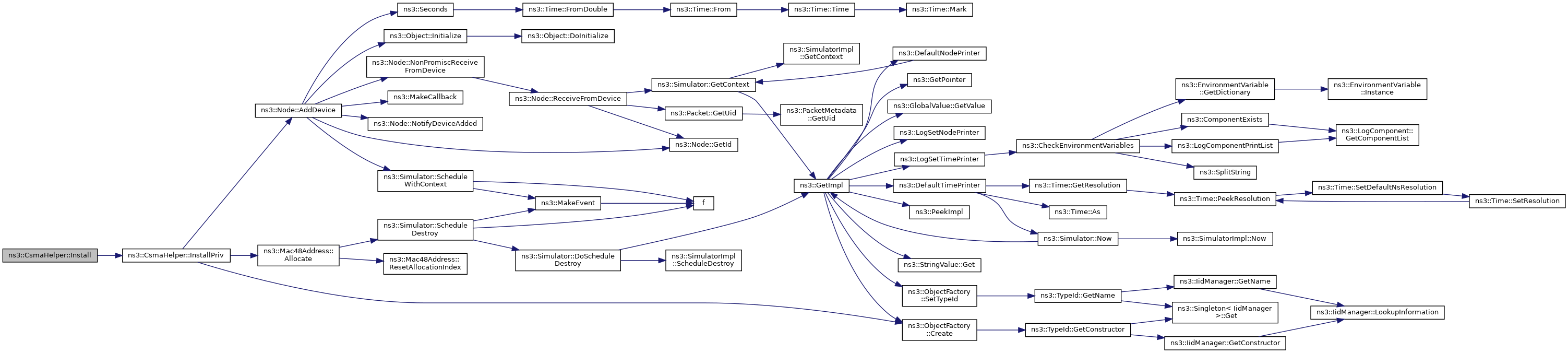 Here is the call graph for this function:| NetDeviceContainer ns3::CsmaHelper::Install | ( | std::string | name | ) | const |