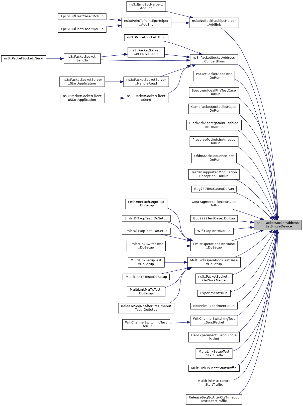 Referenced by ns3::NoBackhaulEpcHelper::AddEnb(), ConvertFrom(), PacketSocketAppsTest::DoRun(), SpectrumIdealPhyTestCase::DoRun(), CsmaPacketSocketTestCase::DoRun(), BlockAckAggregationDisabledTest::DoRun(), PreservePacketsInAmpdus::DoRun(), OfdmaAckSequenceTest::DoRun(), TestUnsupportedModulationReception::DoRun(), Bug730TestCase::DoRun(), QosFragmentationTestCase::DoRun(), Bug2222TestCase::DoRun(), WifiTxopTest::DoRun(), EmlsrOperationsTestBase::DoSetup(), MultiLinkOperationsTestBase::DoSetup(), ns3::PacketSocket::GetSockName(), Experiment::Run(), NetAnimExperiment::Run(), WifiChannelSwitchingTest::SendPacket(), UanExperiment::SendSinglePacket(), MultiLinkSetupTest::StartTraffic(), MultiLinkTxTest::StartTraffic(), MultiLinkMuTxTest::StartTraffic(), and ReleaseSeqNoAfterCtsTimeoutTest::StartTraffic().
