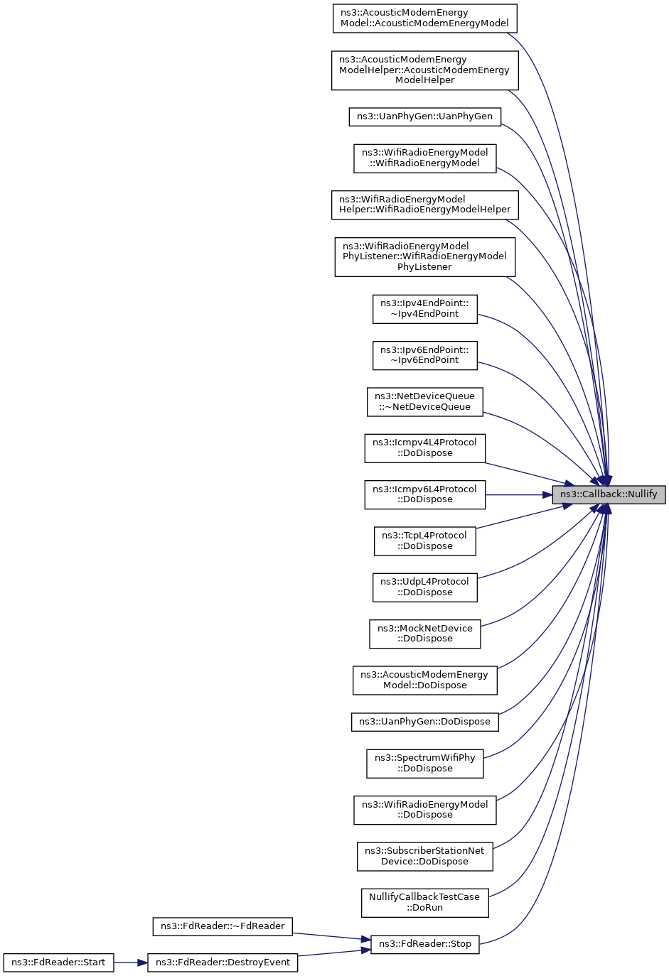 Referenced by ns3::AcousticModemEnergyModel::AcousticModemEnergyModel(), ns3::AcousticModemEnergyModelHelper::AcousticModemEnergyModelHelper(), ns3::UanPhyGen::UanPhyGen(), ns3::WifiRadioEnergyModel::WifiRadioEnergyModel(), ns3::WifiRadioEnergyModelHelper::WifiRadioEnergyModelHelper(), ns3::WifiRadioEnergyModelPhyListener::WifiRadioEnergyModelPhyListener(), ns3::Ipv4EndPoint::~Ipv4EndPoint(), ns3::Ipv6EndPoint::~Ipv6EndPoint(), ns3::NetDeviceQueue::~NetDeviceQueue(), ns3::Icmpv4L4Protocol::DoDispose(), ns3::Icmpv6L4Protocol::DoDispose(), ns3::TcpL4Protocol::DoDispose(), ns3::UdpL4Protocol::DoDispose(), ns3::MockNetDevice::DoDispose(), ns3::AcousticModemEnergyModel::DoDispose(), ns3::UanPhyGen::DoDispose(), ns3::SpectrumWifiPhy::DoDispose(), ns3::WifiRadioEnergyModel::DoDispose(), ns3::SubscriberStationNetDevice::DoDispose(), NullifyCallbackTestCase::DoRun(), and ns3::FdReader::Stop().