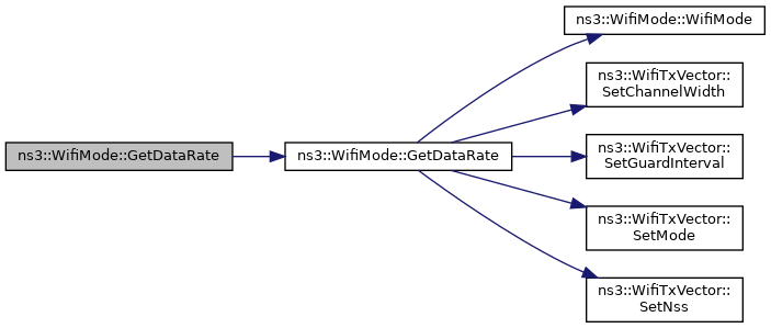 Here is the call graph for this function:| uint64_t ns3::WifiMode::GetDataRate | ( | uint16_t | channelWidth | ) | const |
