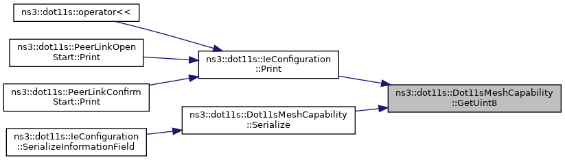 Here is the caller graph for this function:| uint8_t ns3::dot11s::Dot11sMeshCapability::GetUint8 | ( | ) | const |