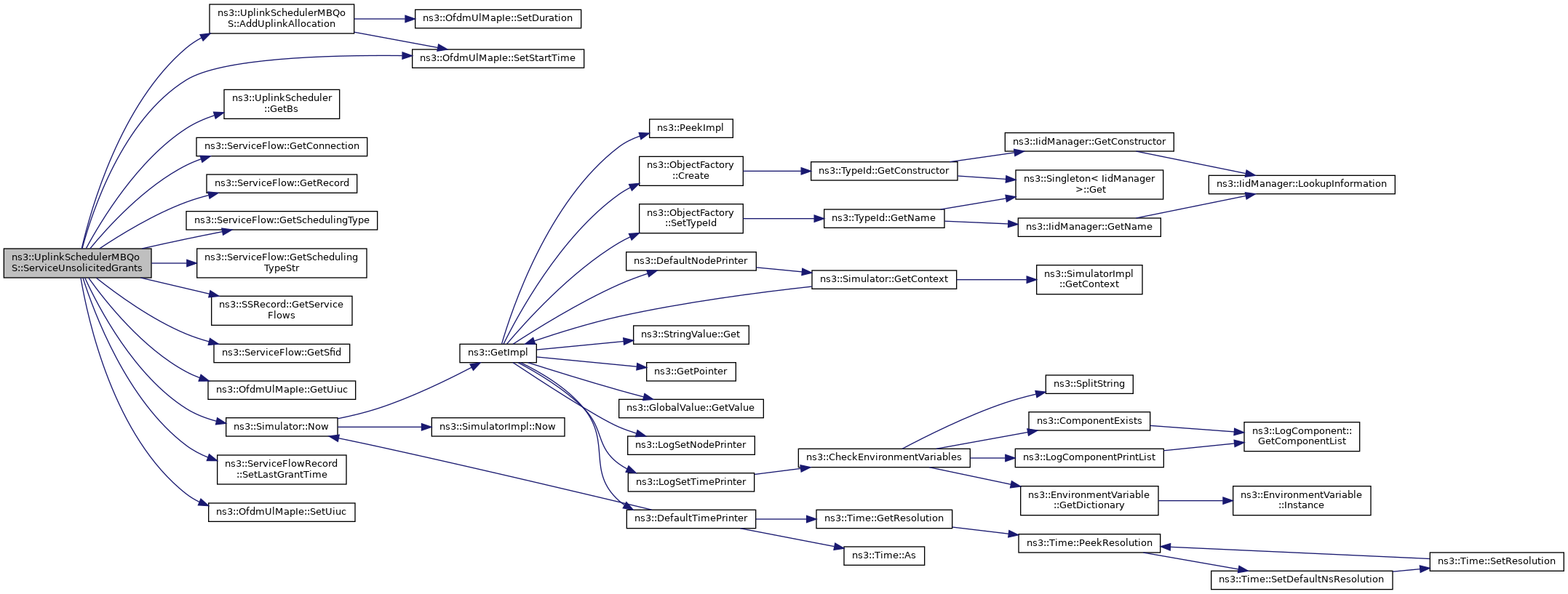 References AddUplinkAllocation(), ns3::UplinkScheduler::GetBs(), ns3::ServiceFlow::GetConnection(), ns3::ServiceFlow::GetRecord(), ns3::ServiceFlow::GetSchedulingType(), ns3::ServiceFlow::GetSchedulingTypeStr(), ns3::SSRecord::GetServiceFlows(), ns3::ServiceFlow::GetSfid(), ns3::OfdmUlMapIe::GetUiuc(), ns3::Simulator::Now(), NS_LOG_DEBUG, ns3::ServiceFlowRecord::SetLastGrantTime(), ns3::OfdmUlMapIe::SetStartTime(), ns3::OfdmUlMapIe::SetUiuc(), ns3::ServiceFlow::SF_TYPE_UGS, and ns3::OfdmUlBurstProfile::UIUC_REQ_REGION_FULL.