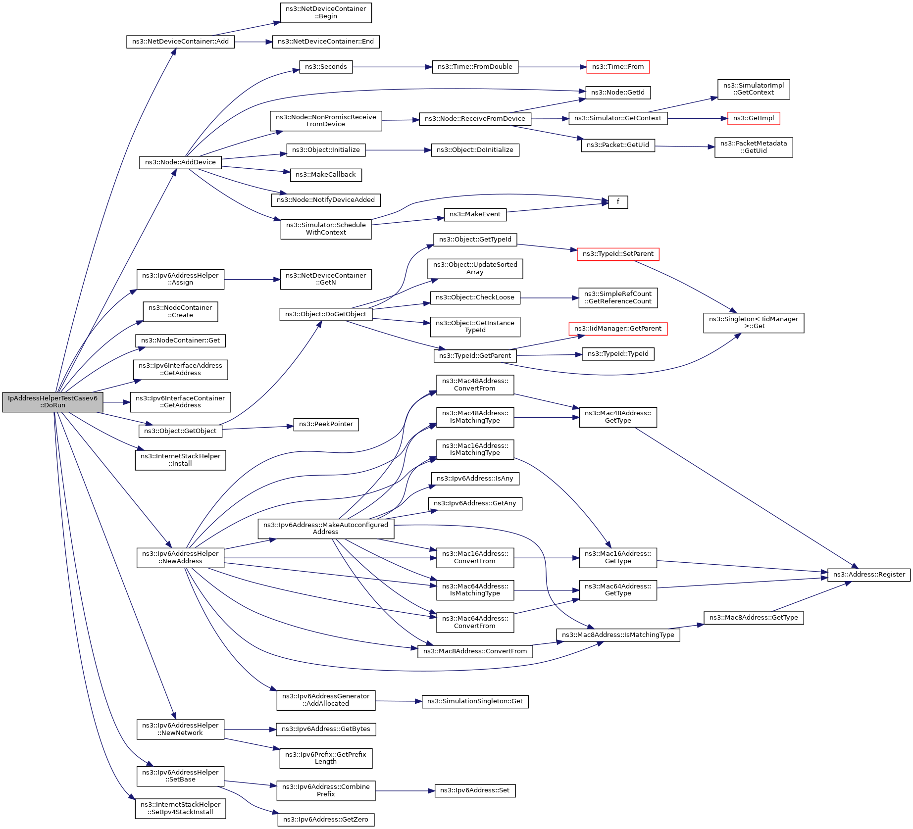 References ns3::NetDeviceContainer::Add(), ns3::Node::AddDevice(), ns3::Ipv6AddressHelper::Assign(), ns3::NodeContainer::Create(), ns3::NodeContainer::Get(), ns3::Ipv6InterfaceAddress::GetAddress(), ns3::Ipv6InterfaceContainer::GetAddress(), ns3::Object::GetObject(), ns3::InternetStackHelper::Install(), ns3::Ipv6AddressHelper::NewAddress(), ns3::Ipv6AddressHelper::NewNetwork(), NS_TEST_ASSERT_MSG_EQ, ns3::Ipv6AddressHelper::SetBase(), and ns3::InternetStackHelper::SetIpv4StackInstall().