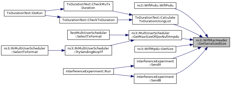 Referenced by WifiMacHeader(), ns3::InterferenceHelper::AddForeignSignal(), TxDurationTest::CalculateTxDurationUsingList(), WifiPhyCcaThresholdsTest::CreateDummyPsdu(), ns3::MeshWifiBeacon::CreateHeader(), OriginatorBlockAckWindowTest::DoRun(), BlockAckRecipientBufferTest::DoRun(), WifiMacQueueDropOldestTest::DoRun(), ns3::FrameExchangeManager::DoSendCtsAfterRts(), WifiPrimaryChannelsTest::DoSendHeTbPpdu(), WifiPrimaryChannelsTest::DoSetup(), ns3::AdhocWifiMac::Enqueue(), ns3::StaWifiMac::Enqueue(), AmpduAggregationTest::EnqueuePkts(), ns3::MeshWifiInterfaceMac::ForwardDown(), ns3::ApWifiMac::ForwardDown(), ns3::dot11s::HwmpProtocolMac::ForwardPerr(), ns3::GetAckSize(), ns3::GetBlockAckRequestSize(), ns3::GetBlockAckSize(), ns3::GetCtsSize(), ns3::GetMuBarSize(), ns3::GetRtsSize(), SpectrumWifiPhyBasicTest::MakeSignal(), WifiPhyThresholdsTest::MakeWifiSignal(), ns3::BlockAckManager::NotifyDiscardedMpdu(), ns3::HeFrameExchangeManager::PostProcessFrame(), ns3::QosTxop::PrepareBlockAckRequest(), ns3::HeFrameExchangeManager::PrepareMuBar(), TestMultipleHeTbPreambles::RxHeTbPpdu(), TestSpectrumChannelWithBandwidthFilter::Send(), InterferenceExperiment::SendA(), ns3::HtFrameExchangeManager::SendAddBaRequest(), ns3::HtFrameExchangeManager::SendAddBaResponse(), TestAmpduReception::SendAmpduWithThreeMpdus(), ns3::StaWifiMac::SendAssociationRequest(), ns3::ApWifiMac::SendAssocResp(), InterferenceExperiment::SendB(), ns3::HtFrameExchangeManager::SendBlockAck(), ns3::QosFrameExchangeManager::SendCfEndIfNeeded(), ns3::FrameExchangeManager::SendCtsToSelf(), ns3::HtFrameExchangeManager::SendDelbaFrame(), WifiPrimaryChannelsTest::SendDlMuPpdu(), WifiPrimaryChannelsTest::SendDlSuPpdu(), ns3::EhtFrameExchangeManager::SendEmlOmn(), WifiPhyCcaIndicationTest::SendHeSuPpdu(), TestUlMuMimoPhyTransmission::SendHeSuPpdu(), TestUlOfdmaPhyTransmission::SendHeSuPpdu(), TestPhyPaddingExclusion::SendHeTbPpdu(), TestUlOfdmaPhyTransmission::SendHeTbPpdu(), TestUlMuMimoPhyTransmission::SendHeTbPpdu(), TestUlOfdmaPowerControl::SendMuBar(), ns3::HeFrameExchangeManager::SendMultiStaBlockAck(), TestUlOfdmaPpduUid::SendMuPpdu(), TestDlMuMimoPhyTransmission::SendMuPpdu(), TestDlOfdmaPhyTransmission::SendMuPpdu(), TestDlOfdmaPhyPuncturing::SendMuPpdu(), ns3::HeFrameExchangeManager::SendMuRts(), TestNonHtDuplicatePhyReception::SendNonHtDuplicatePpdu(), ns3::FrameExchangeManager::SendNormalAck(), ns3::ApWifiMac::SendOneBeacon(), WifiPhyReceptionTest::SendPacket(), ns3::dot11s::PeerManagementProtocolMac::SendPeerLinkManagementFrame(), SpectrumWifiPhyFilterTest::SendPpdu(), SpectrumWifiPhyMultipleInterfacesTest::SendPpdu(), TestUnsupportedBandwidthReception::SendPpdu(), ns3::dot11s::HwmpProtocolMac::SendPrep(), ns3::dot11s::HwmpProtocolMac::SendPreqVector(), ns3::StaWifiMac::SendProbeRequest(), ns3::ApWifiMac::SendProbeResp(), ns3::HeFrameExchangeManager::SendQosNullFramesInTbPpdu(), ns3::FrameExchangeManager::SendRts(), TestUlOfdmaPpduUid::SendSuPpdu(), TestUlOfdmaPpduUid::SendTbPpdu(), ns3::dot11s::AirtimeLinkMetricCalculator::SetHeaderTid(), PowerRateAdaptationTest::TestAparf(), PowerRateAdaptationTest::TestParf(), PowerRateAdaptationTest::TestRrpaa(), and TestMultipleCtsResponsesFromMuRts::TxNonHtDuplicateCts().