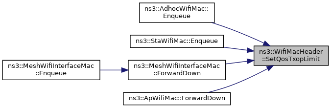 Here is the caller graph for this function:| void ns3::WifiMacHeader::SetQosTxopLimit | ( | uint8_t | txop | ) |