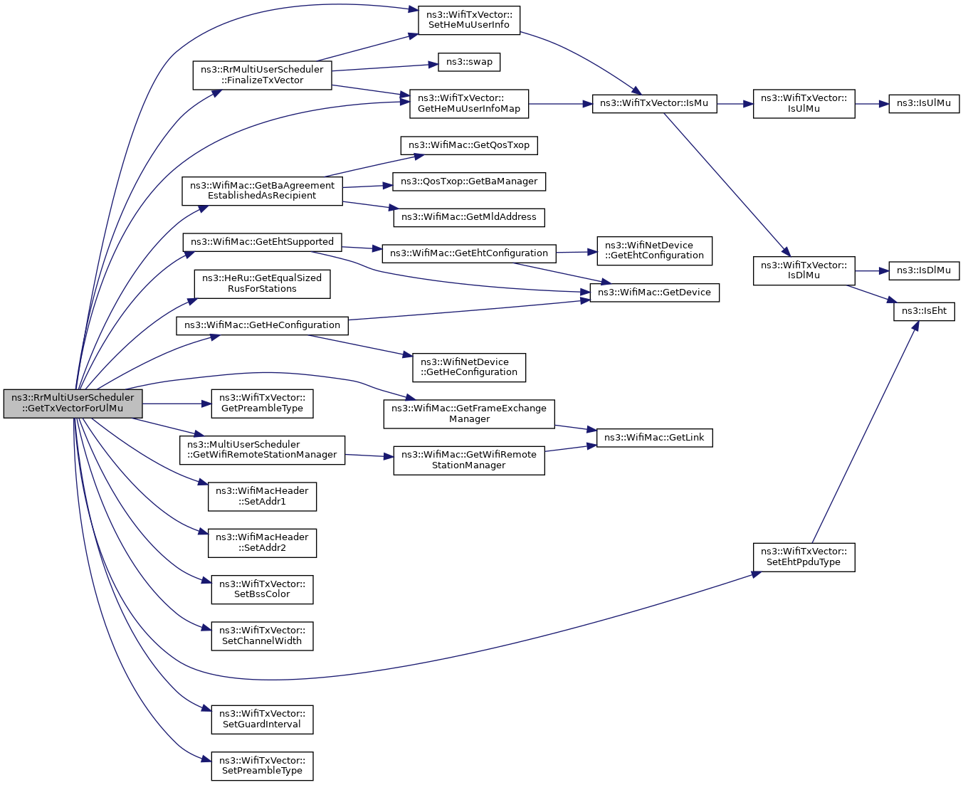 References FinalizeTxVector(), ns3::WifiMac::GetBaAgreementEstablishedAsRecipient(), ns3::WifiMac::GetEhtSupported(), ns3::HeRu::GetEqualSizedRusForStations(), ns3::WifiMac::GetFrameExchangeManager(), ns3::WifiMac::GetHeConfiguration(), ns3::WifiTxVector::GetHeMuUserInfoMap(), ns3::WifiTxVector::GetPreambleType(), ns3::MultiUserScheduler::GetWifiRemoteStationManager(), ns3::MultiUserScheduler::m_allowedWidth, ns3::MultiUserScheduler::m_apMac, m_candidates, ns3::MultiUserScheduler::m_linkId, m_nStations, m_staListUl, m_useCentral26TonesRus, NS_ASSERT, NS_LOG_DEBUG, NS_LOG_FUNCTION, ns3::WifiMacHeader::SetAddr1(), ns3::WifiMacHeader::SetAddr2(), ns3::WifiTxVector::SetBssColor(), ns3::WifiTxVector::SetChannelWidth(), ns3::WifiTxVector::SetEhtPpduType(), ns3::WifiTxVector::SetGuardInterval(), ns3::WifiTxVector::SetHeMuUserInfo(), ns3::WifiTxVector::SetPreambleType(), ns3::WIFI_MAC_QOSDATA, ns3::WIFI_PREAMBLE_EHT_TB, and ns3::WIFI_PREAMBLE_HE_TB.