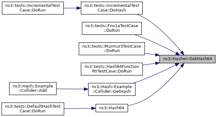 Referenced by ns3::tests::IncrementalTestCase::DoHash(), ns3::tests::Fnv1aTestCase::DoRun(), ns3::tests::Murmur3TestCase::DoRun(), ns3::tests::Hash64FunctionPtrTestCase::DoRun(), ns3::Hash::Example::Collider::GetHash(), and ns3::Hash64().