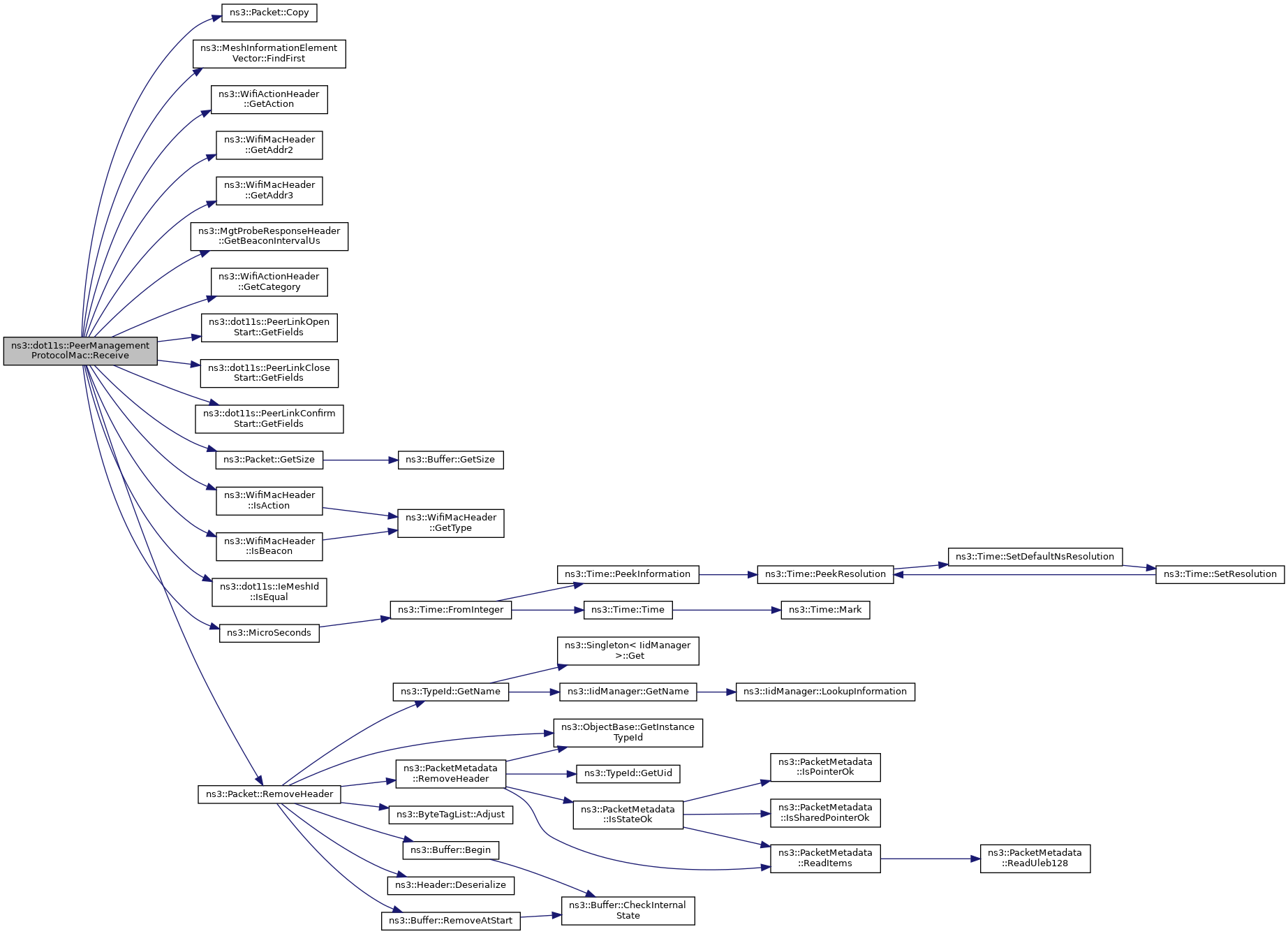 References ns3::dot11s::PeerLinkConfirmStart::PlinkConfirmStartFields::aid, ns3::dot11s::PeerManagementProtocolMac::Statistics::brokenMgt, ns3::dot11s::PeerLinkOpenStart::PlinkOpenStartFields::config, ns3::dot11s::PeerLinkConfirmStart::PlinkConfirmStartFields::config, ns3::Packet::Copy(), ns3::MeshInformationElementVector::FindFirst(), ns3::WifiActionHeader::GetAction(), ns3::WifiMacHeader::GetAddr2(), ns3::WifiMacHeader::GetAddr3(), ns3::MgtProbeResponseHeader::GetBeaconIntervalUs(), ns3::WifiActionHeader::GetCategory(), ns3::dot11s::PeerLinkOpenStart::GetFields(), ns3::dot11s::PeerLinkCloseStart::GetFields(), ns3::dot11s::PeerLinkConfirmStart::GetFields(), ns3::Packet::GetSize(), IE_BEACON_TIMING, IE_MESH_ID, IE_MESH_PEERING_MANAGEMENT, ns3::WifiMacHeader::IsAction(), ns3::WifiMacHeader::IsBeacon(), ns3::dot11s::IeMeshId::IsEqual(), m_ifIndex, m_parent, m_protocol, m_stats, ns3::dot11s::PeerLinkOpenStart::PlinkOpenStartFields::meshId, ns3::dot11s::PeerLinkCloseStart::PlinkCloseStartFields::meshId, ns3::MicroSeconds(), NS_ASSERT, NS_FATAL_ERROR, NS_LOG_DEBUG, NS_LOG_FUNCTION, ns3::WifiActionHeader::PEER_LINK_CLOSE, ns3::WifiActionHeader::PEER_LINK_CONFIRM, ns3::WifiActionHeader::PEER_LINK_OPEN, ns3::Packet::RemoveHeader(), ns3::dot11s::PeerManagementProtocolMac::Statistics::rxClose, ns3::dot11s::PeerManagementProtocolMac::Statistics::rxConfirm, ns3::dot11s::PeerManagementProtocolMac::Statistics::rxMgt, ns3::dot11s::PeerManagementProtocolMac::Statistics::rxMgtBytes, ns3::dot11s::PeerManagementProtocolMac::Statistics::rxOpen, ns3::WifiActionHeader::SELF_PROTECTED, and ns3::WifiActionHeader::ActionValue::selfProtectedAction.