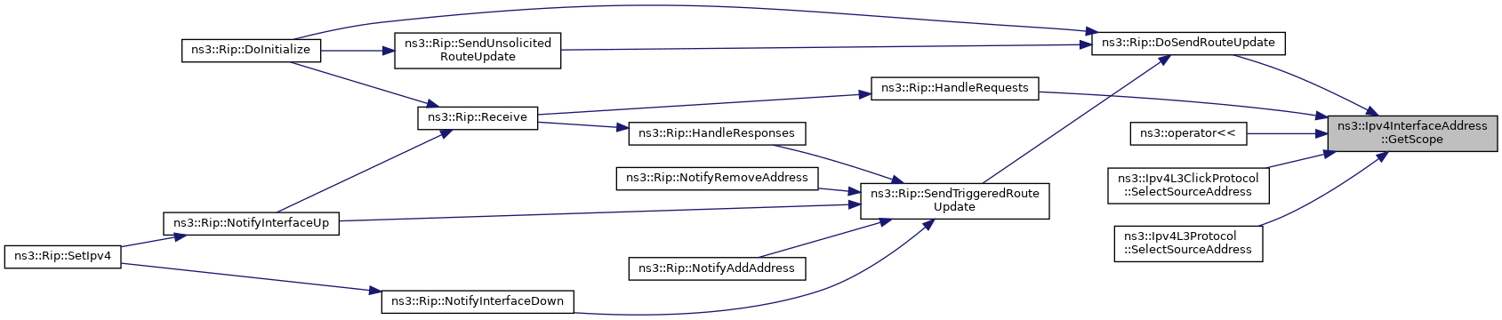 Here is the caller graph for this function:| Ipv4InterfaceAddress::InterfaceAddressScope_e ns3::Ipv4InterfaceAddress::GetScope | ( | ) | const |