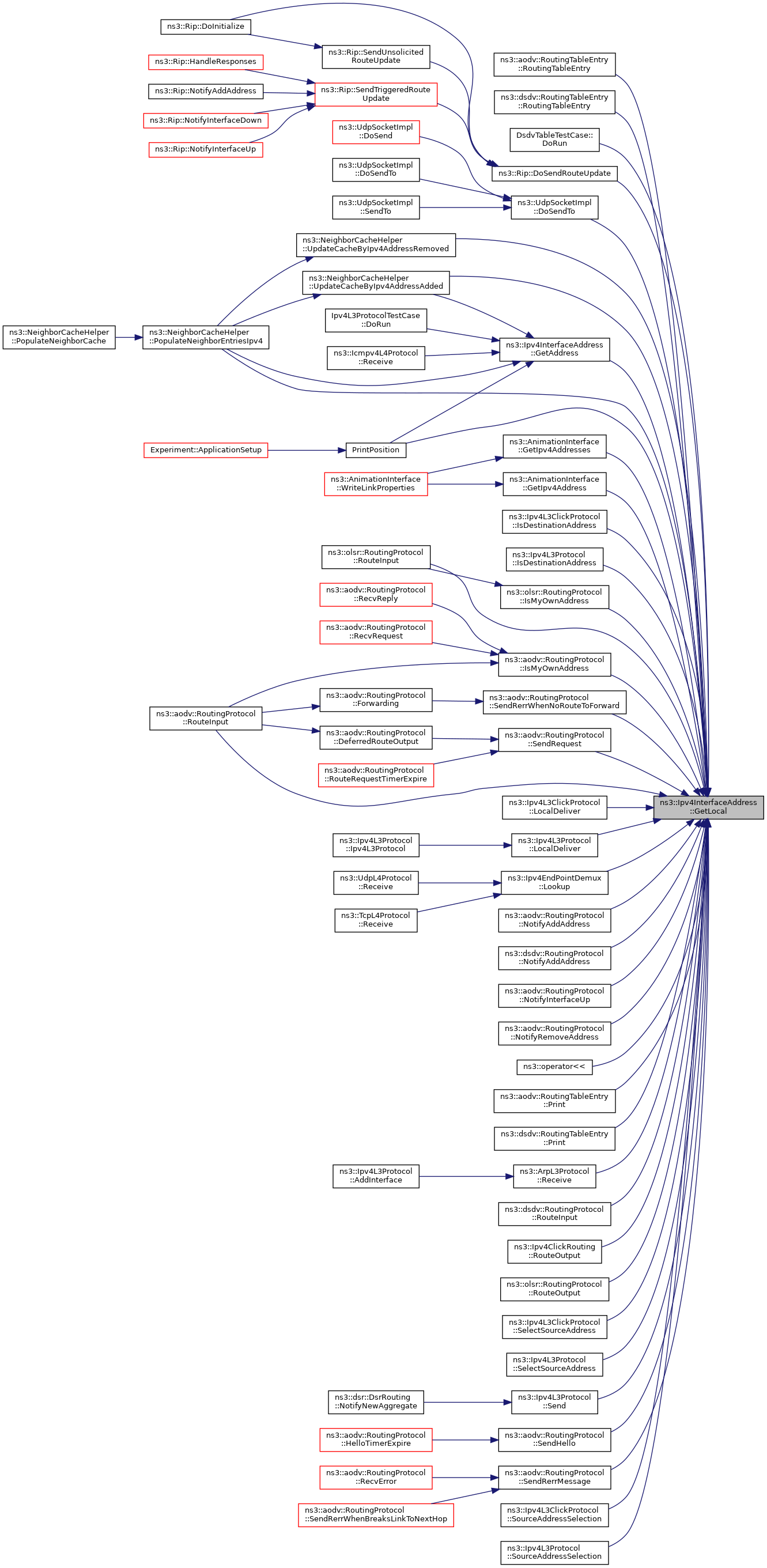 Referenced by ns3::aodv::RoutingTableEntry::RoutingTableEntry(), ns3::dsdv::RoutingTableEntry::RoutingTableEntry(), DsdvTableTestCase::DoRun(), ns3::Rip::DoSendRouteUpdate(), ns3::UdpSocketImpl::DoSendTo(), GetAddress(), ns3::AnimationInterface::GetIpv4Address(), ns3::AnimationInterface::GetIpv4Addresses(), ns3::Ipv4L3ClickProtocol::IsDestinationAddress(), ns3::Ipv4L3Protocol::IsDestinationAddress(), ns3::olsr::RoutingProtocol::IsMyOwnAddress(), ns3::aodv::RoutingProtocol::IsMyOwnAddress(), ns3::Ipv4L3ClickProtocol::LocalDeliver(), ns3::Ipv4L3Protocol::LocalDeliver(), ns3::Ipv4EndPointDemux::Lookup(), ns3::aodv::RoutingProtocol::NotifyAddAddress(), ns3::dsdv::RoutingProtocol::NotifyAddAddress(), ns3::aodv::RoutingProtocol::NotifyInterfaceUp(), ns3::aodv::RoutingProtocol::NotifyRemoveAddress(), ns3::operator<<(), ns3::NeighborCacheHelper::PopulateNeighborEntriesIpv4(), ns3::aodv::RoutingTableEntry::Print(), ns3::dsdv::RoutingTableEntry::Print(), PrintPosition(), ns3::ArpL3Protocol::Receive(), ns3::aodv::RoutingProtocol::RouteInput(), ns3::dsdv::RoutingProtocol::RouteInput(), ns3::olsr::RoutingProtocol::RouteInput(), ns3::Ipv4ClickRouting::RouteOutput(), ns3::olsr::RoutingProtocol::RouteOutput(), ns3::Ipv4L3ClickProtocol::SelectSourceAddress(), ns3::Ipv4L3Protocol::SelectSourceAddress(), ns3::Ipv4L3Protocol::Send(), ns3::aodv::RoutingProtocol::SendHello(), ns3::aodv::RoutingProtocol::SendRequest(), ns3::aodv::RoutingProtocol::SendRerrMessage(), ns3::aodv::RoutingProtocol::SendRerrWhenNoRouteToForward(), ns3::Ipv4L3ClickProtocol::SourceAddressSelection(), ns3::Ipv4L3Protocol::SourceAddressSelection(), ns3::NeighborCacheHelper::UpdateCacheByIpv4AddressAdded(), and ns3::NeighborCacheHelper::UpdateCacheByIpv4AddressRemoved().