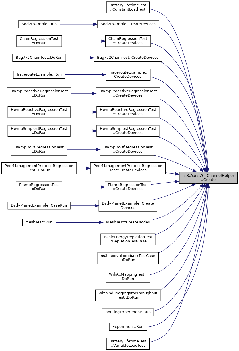 Referenced by ChainRegressionTest::CreateDevices(), Bug772ChainTest::CreateDevices(), HwmpProactiveRegressionTest::CreateDevices(), HwmpReactiveRegressionTest::CreateDevices(), HwmpSimplestRegressionTest::CreateDevices(), HwmpDoRfRegressionTest::CreateDevices(), PeerManagementProtocolRegressionTest::CreateDevices(), and FlameRegressionTest::CreateDevices().
