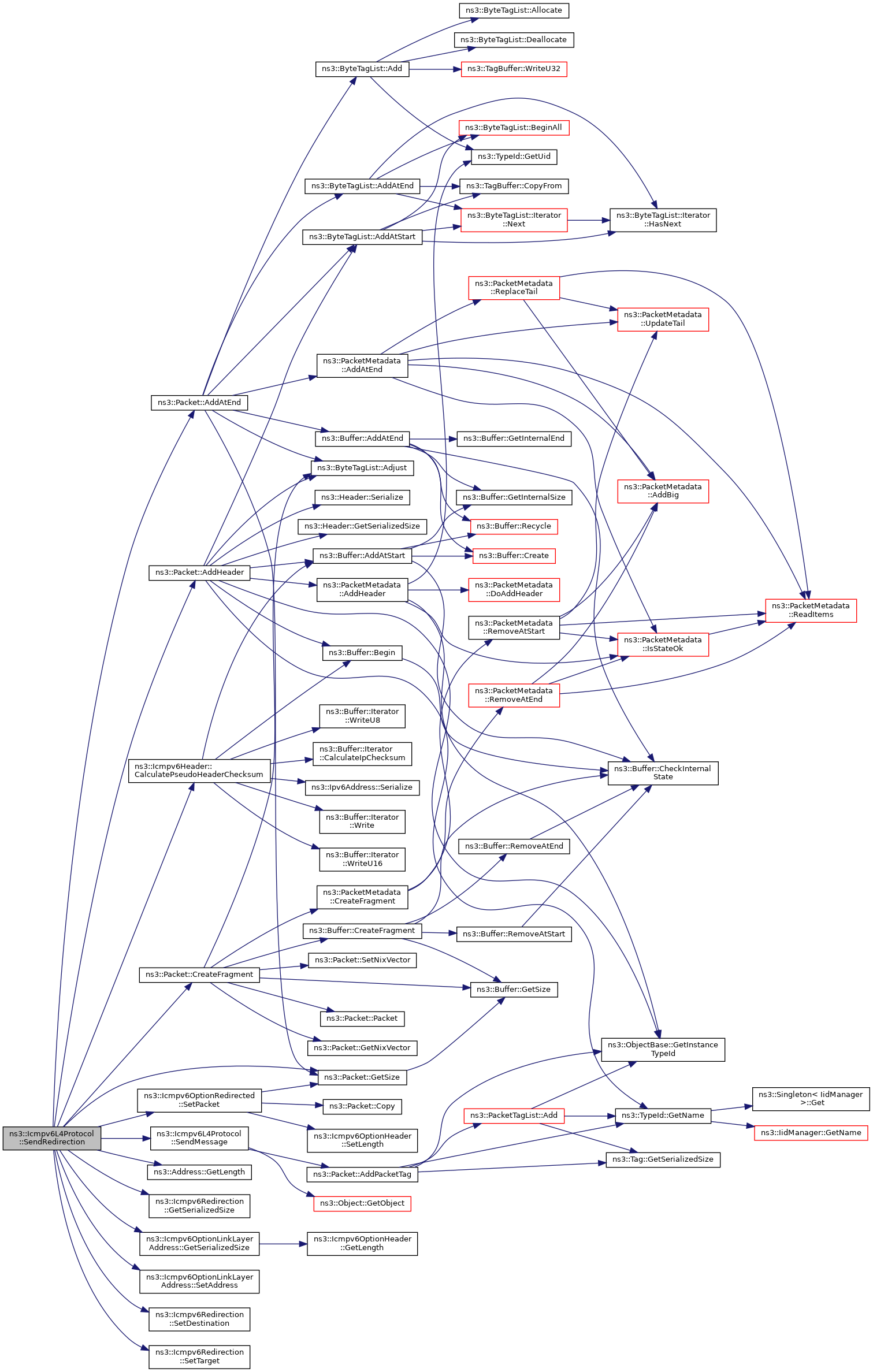 References ns3::Packet::AddAtEnd(), ns3::Packet::AddHeader(), ns3::Icmpv6Header::CalculatePseudoHeaderChecksum(), ns3::Packet::CreateFragment(), ns3::Address::GetLength(), ns3::Icmpv6Redirection::GetSerializedSize(), ns3::Icmpv6OptionLinkLayerAddress::GetSerializedSize(), ns3::Packet::GetSize(), NS_LOG_FUNCTION, NS_LOG_LOGIC, PROT_NUMBER, SendMessage(), ns3::Icmpv6OptionLinkLayerAddress::SetAddress(), ns3::Icmpv6Redirection::SetDestination(), ns3::Icmpv6OptionRedirected::SetPacket(), and ns3::Icmpv6Redirection::SetTarget().